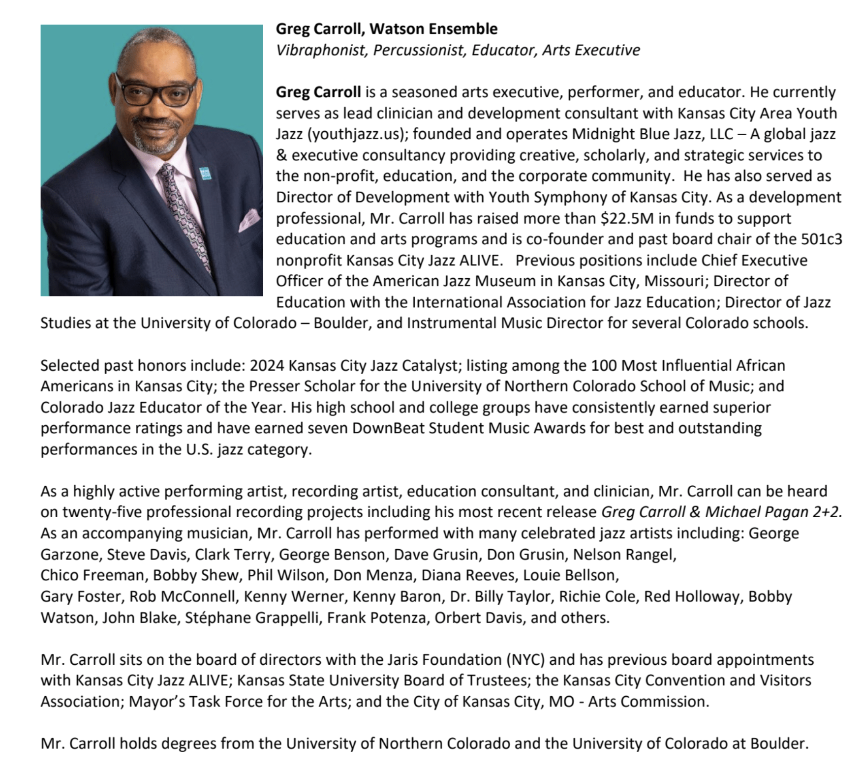 “The Kansas City Area Youth Jazz organization is one of the finest organizations that I have ever worked with for teaching young people the art of jazz. I wished that I had something like this as a young person and now I am always looking to recruit some of those students into my program at UMKC. They are doing great work.”